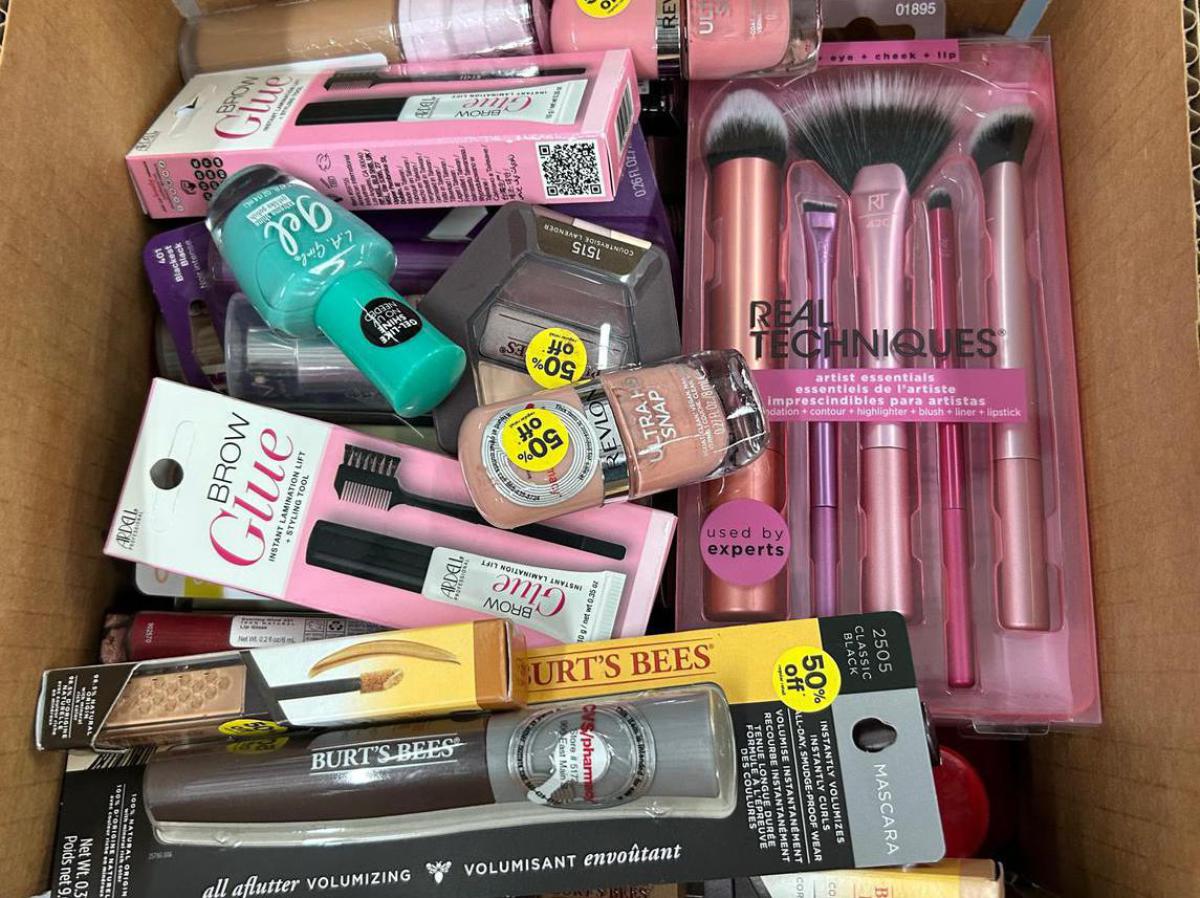 El lote de cosmetico contiene 100 piezas, entre ellas podra encontrar labiales, sombras, rimel, delineadores, bases de maquillaje, accesorios para las pestanas o unas,